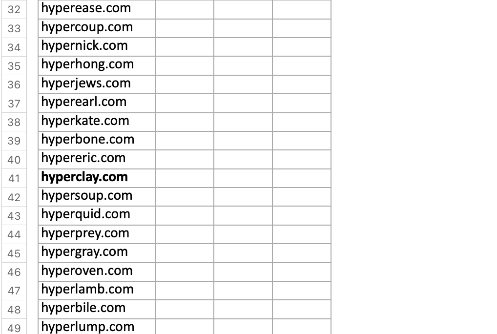 I did two rounds of checks, for a total of 3,000 queries. Out of these, 1,250 were available domains! I carefully scanned them all by hand. Several caught my attention, like hyperpoet.com, hyperclay.com, hyperpond.com, hyperlava.com, and hyperput.com.